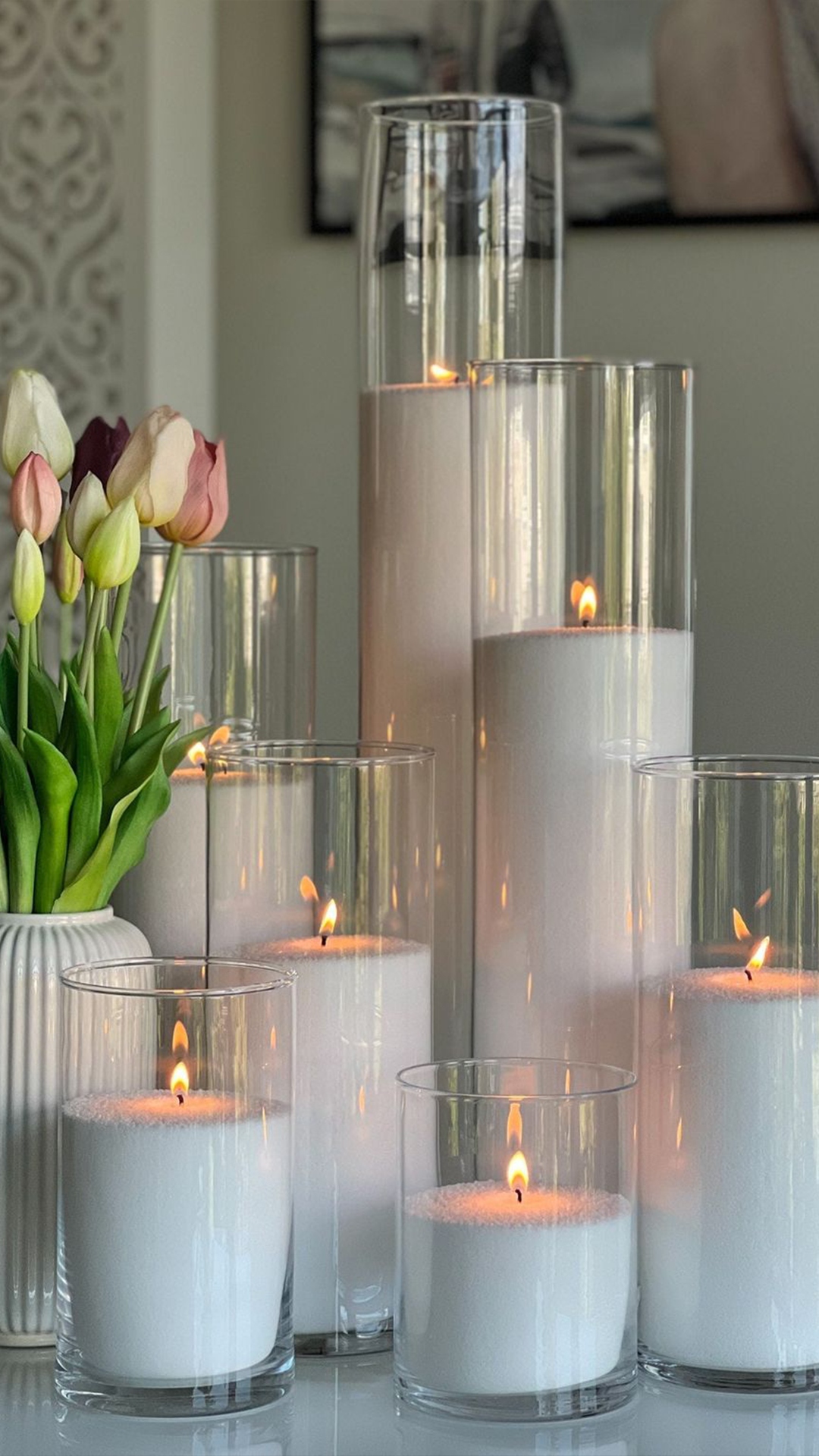 Es una de las decoraciones más bonitas. Nuestras perlas blancas para velas flotan en el agua. Solo tienes que colocar las decoraciones en un jarrón, llénalo de agua hasta que queden sumergidas y luego vierte arena de Candil de Arena encima. Vierte al menos 3 cm de perlas blancas sobre el agua y asegurándote de que la base de la mecha no toque el agua.