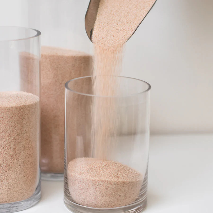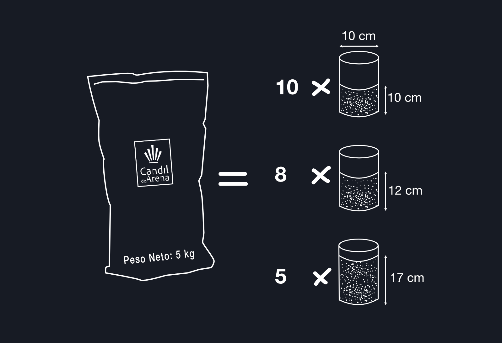 Con una bolsa de 5 Kg de Candil de Arena puedes tener 10 velas en recipientes cilíndricos de 10 cm de ancho llenándolos hasta 10 cm de alto.