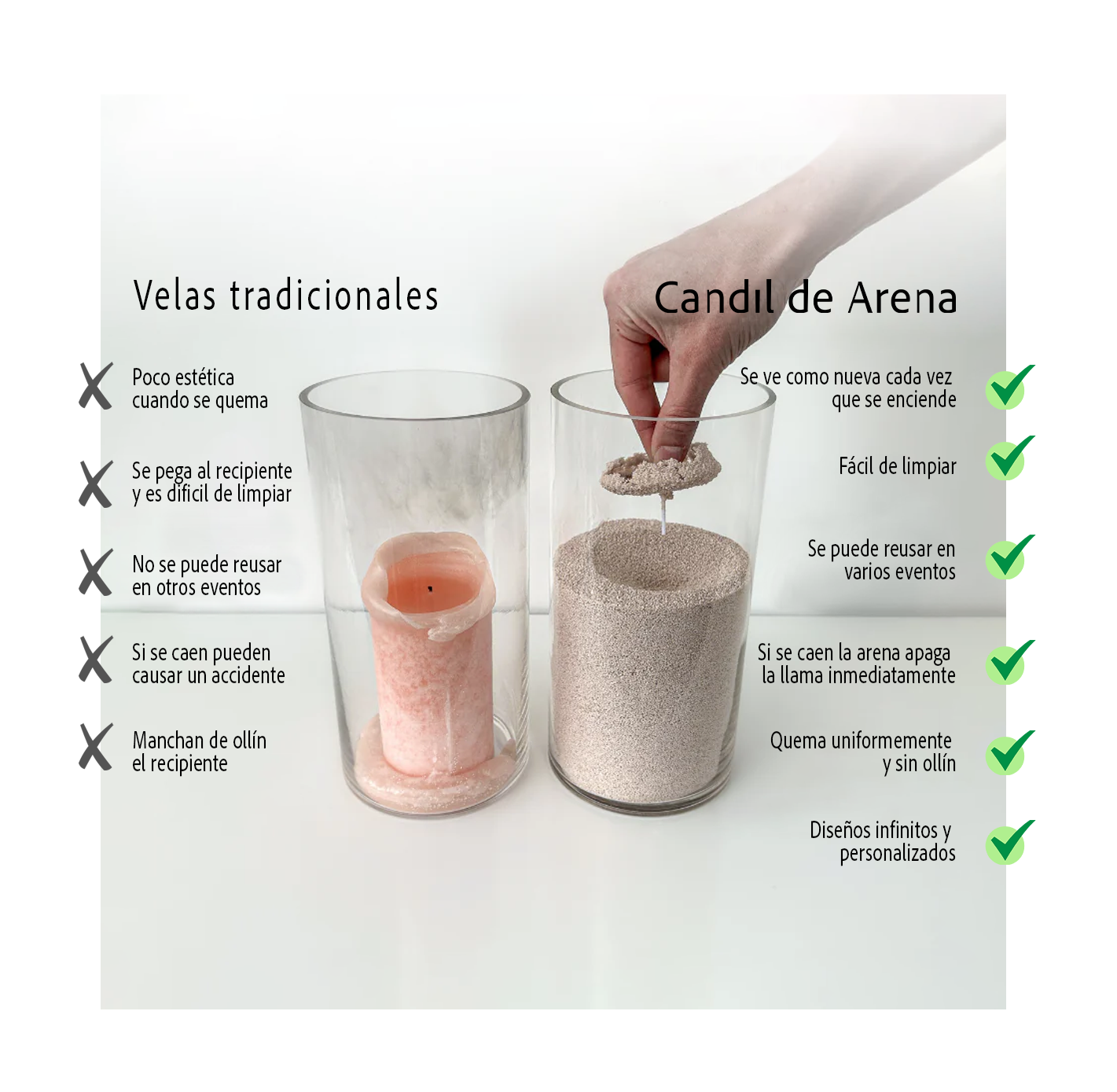 A diferencia de las velas tradicionales las velas de arena se apagan inmediatamente si se cae el recipiente lo que puede evitar muchos accidentes.