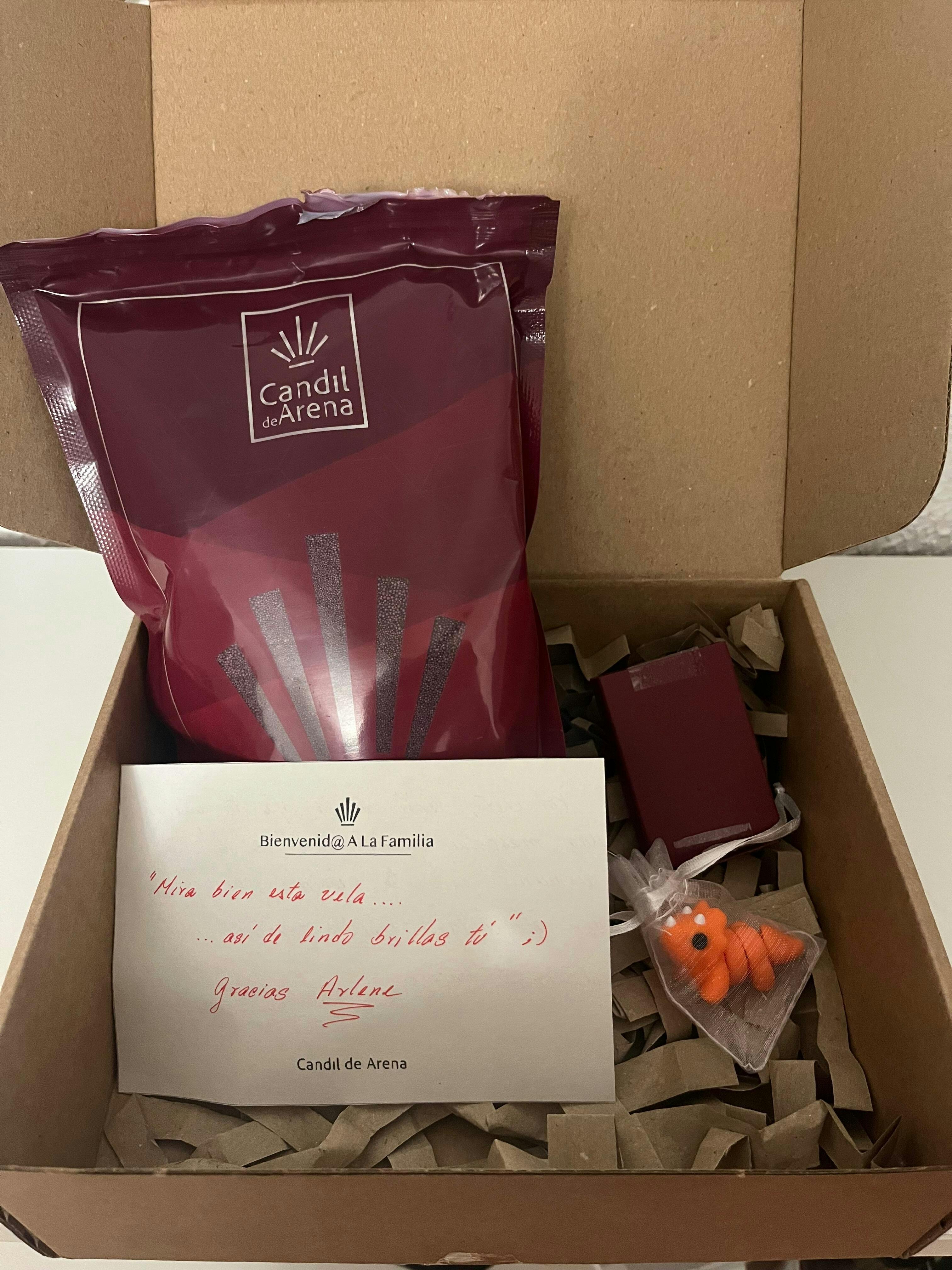 Cada pedido te llega con la bolsa de vela de arena de 500 g y una caja de con 20 mechas de 5 cm de largo que equivalen a más de 120 horas de quemado.
